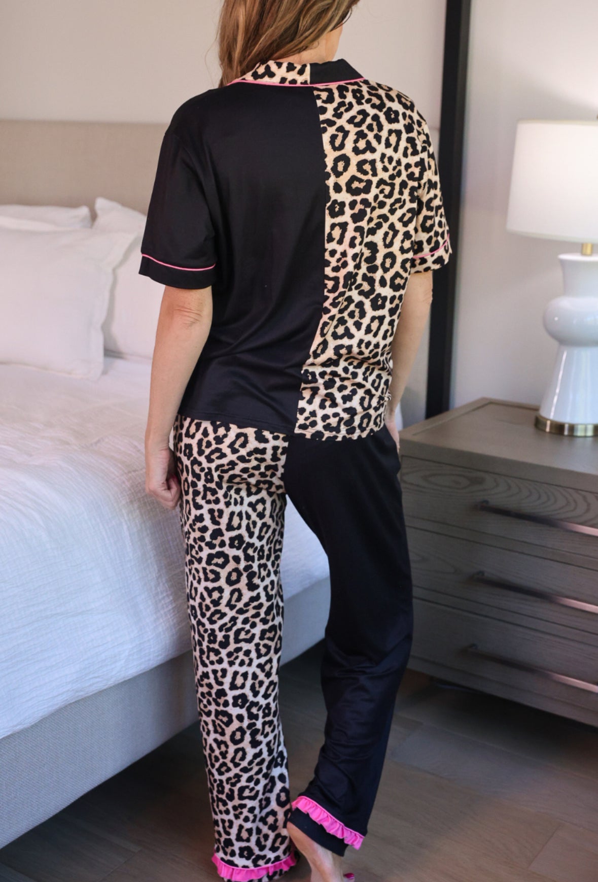 Elevate your sleepwear collection with these striking leopard ruffle pajamas, designed for those who refuse to compromise on style after dark. The bold animal print commands attention while the delicate ruffle detailing adds a touch of feminine sophistication. Crafted for comfort, these pajamas feature a flattering silhouette that transitions seamlessly from bedroom to casual lounging. The soft fabric ensures breathability and ease of movement throughout the night, while the timeless leopard pattern pairs effortlessly with your existing wardrobe. Perfect for anyone seeking to infuse their nighttime routine with confidence and flair.